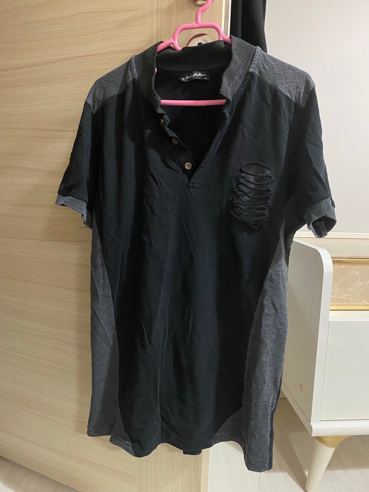 Düğmeli, yakalı, kısa kollu siyah keten erkek polo tişört. Göğüste yırtık detaylı, rahat kesim, günlük sokak stili için uygun.