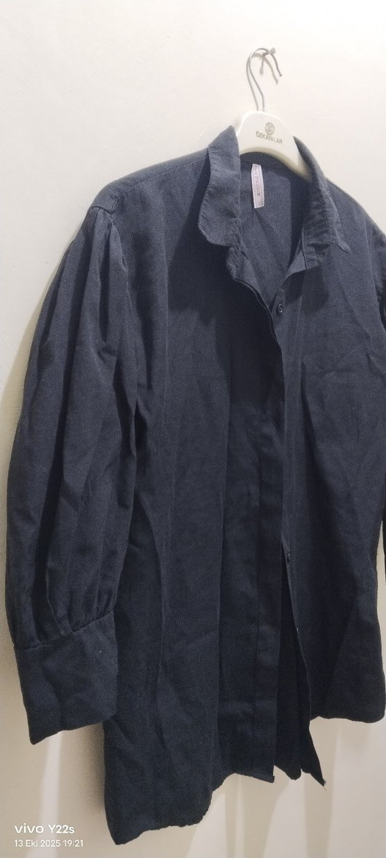 Düğmeli önü ve kesik yaka detayı olan siyah keten gömlek, uzun kollu ve bol kesimdir. Günlük rahat kullanıma uygundur.