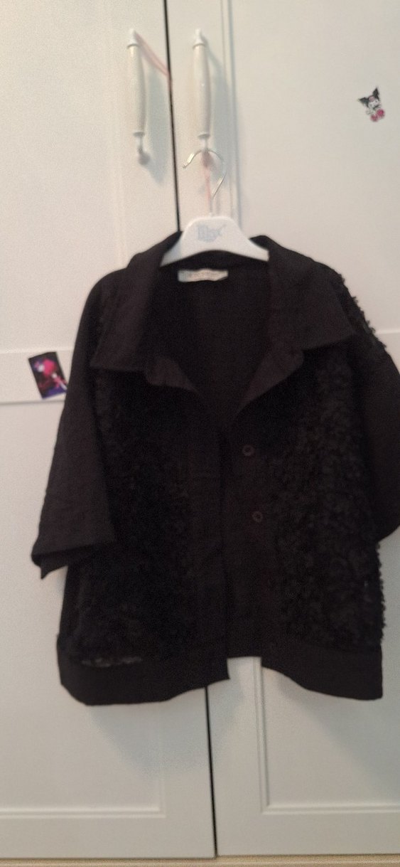 Düğmeli, siyah keten kumaştan midi boy, bol kesim Kısa kollu ve kesik yaka detaylı, hic giyilmedi sifir ürün