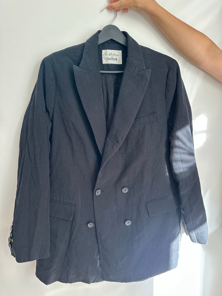 Siyah keten kumaştan düğmeli kadın blazer. Uzun kollu, normal boy ve regular fit kesim, ofis kullanımı için uygundur.