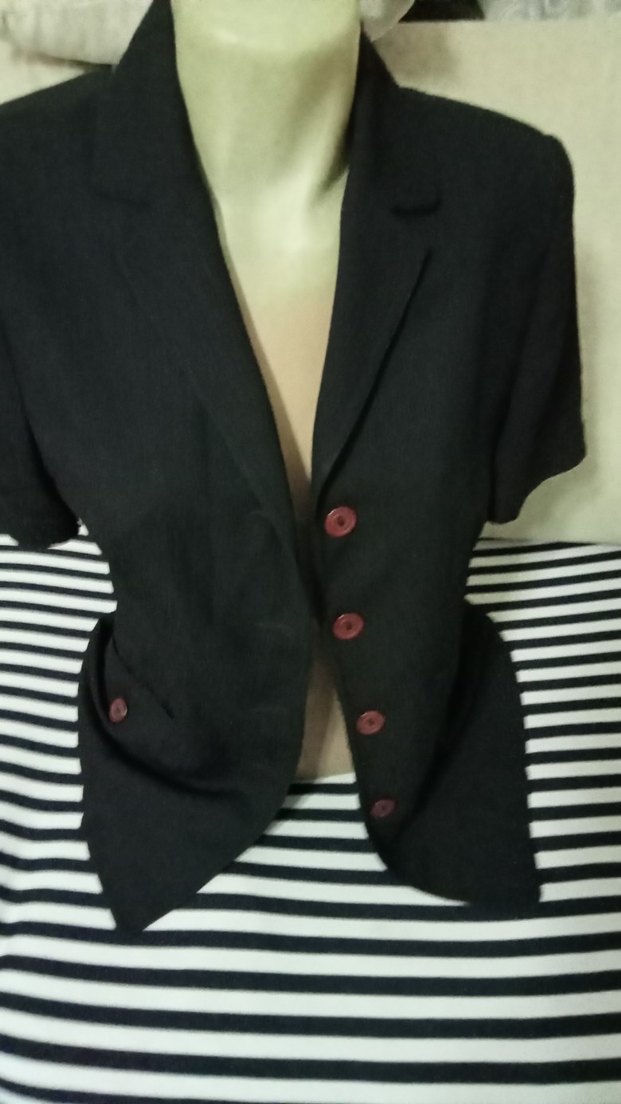 Keten kumaştan, kısa kollu, düğmeli siyah kadın blazer. Normal uzunlukta, kesimi rahat ve ofis için uygun.