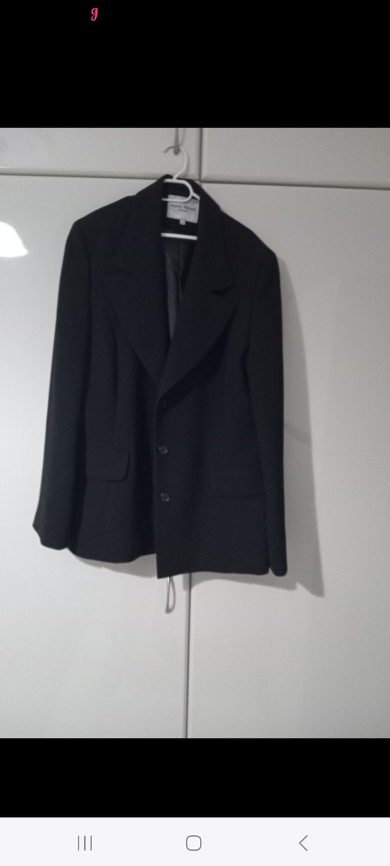 Siyah keten kumaştan yapılmış, düğmeli ve uzun kollu kadın blazer ceket. Normal kesim ve midi boydadır, ofis için klasik goth tarzını yansıtır.