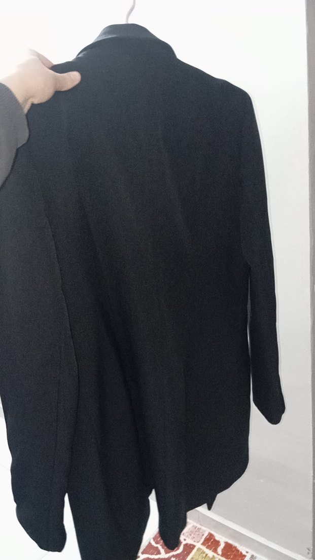 Siyah keten kumaştan yapılmış, düğmeli ve normal boy midi uzunluğunda kadın blazer. Uzun kollu, kesimi rahat ve ofis için uygun minimal tasarım. 3 kez giyildi