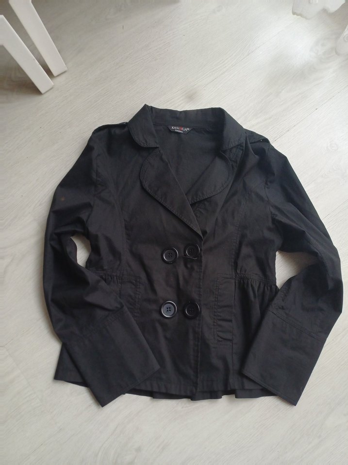 Düğmeli ön kısmı ve kesik yaka detayıyla siyah keten ceket, uzun kollu ve normal kesimdir, ofis için uygun şık bir seçenektir. kolunda ufak çamaşır suyu lekesi var başka hiç bişeyi yok rengi canlı spor arka pile lastik detaylı