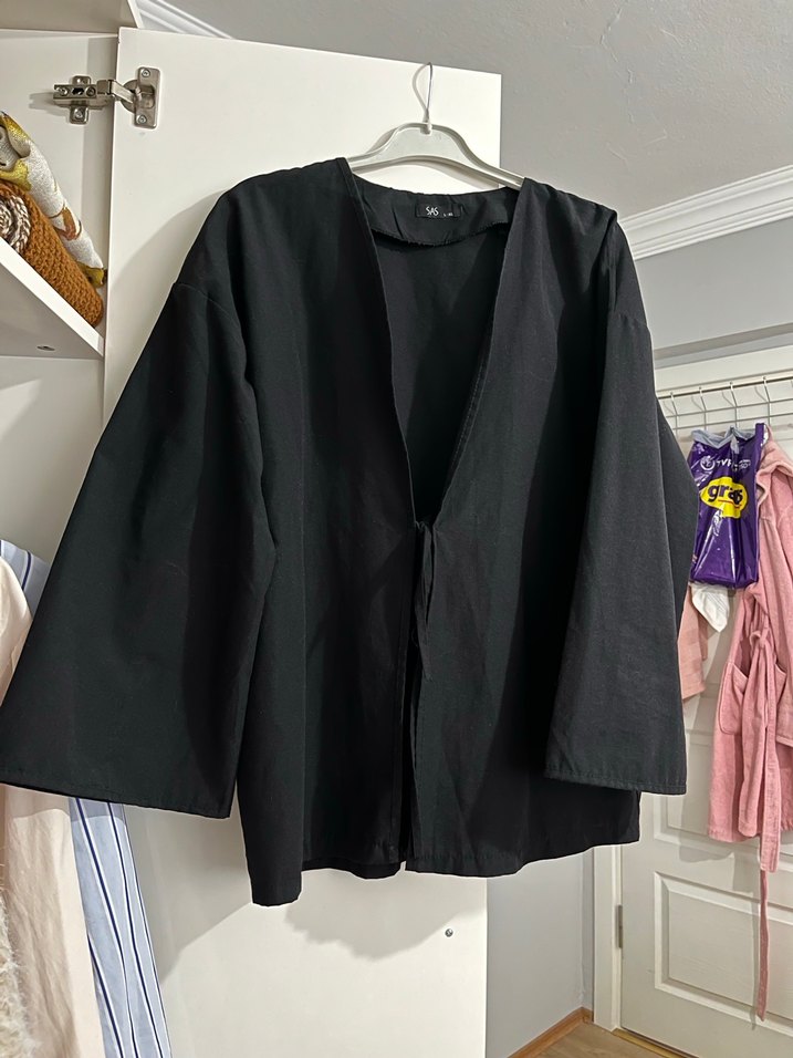 Düğmeli, uzun kollu, keten kumaştan yapılmış siyah ceket. Bol kesim ve normal boyuyla minimal ve normcore tarzı sunar, günlük kullanıma uygundur.