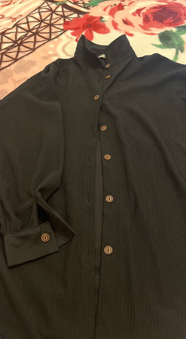 Siyah keten kumaştan, düğmeli ve uzun kollu kadın gömleği. Notlu yaka ve rahat kesimiyle ofis için uygundur.