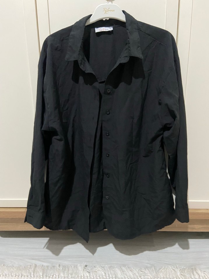 Düğmeli, keten kumaştan siyah kadın gömlek. Notlu yaka ve uzun kollu, bol kesim, normal boyda. Ofis için uygun, sade ve minimal tarzda.