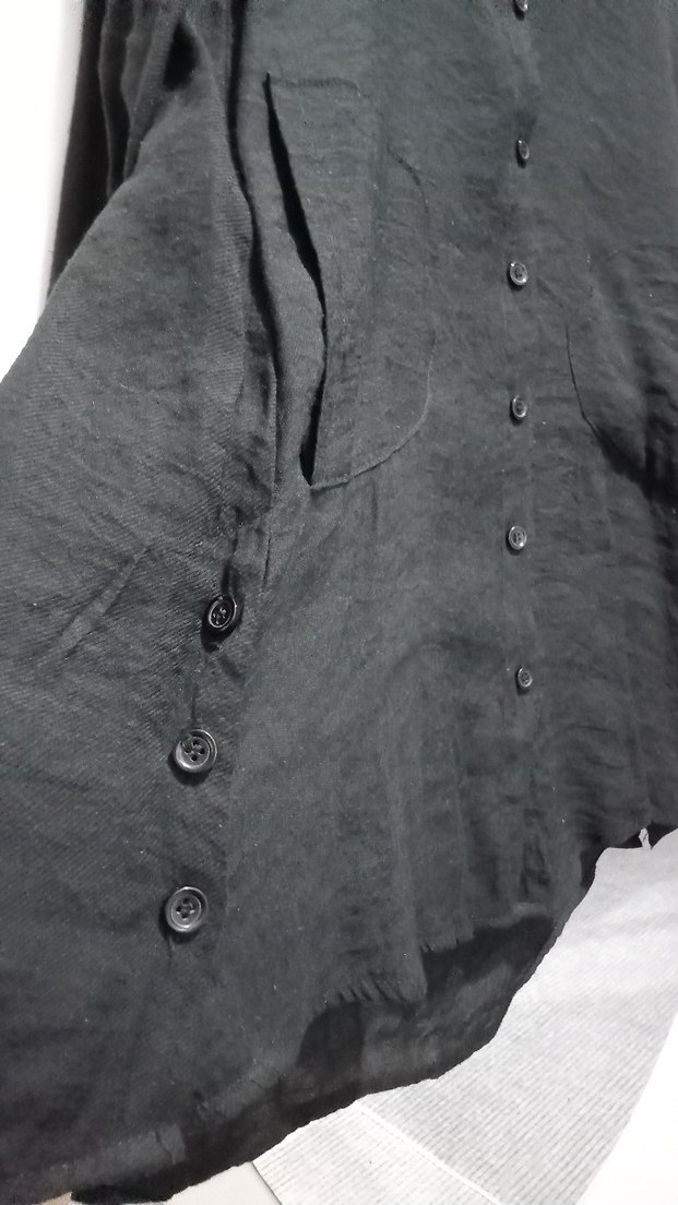 Düğmeli, keten kumaştan yapılmış siyah, bol kesim kadın gömlek. Notlu yaka ve uzun kolludur, minimal ve normcore tarzındadır.