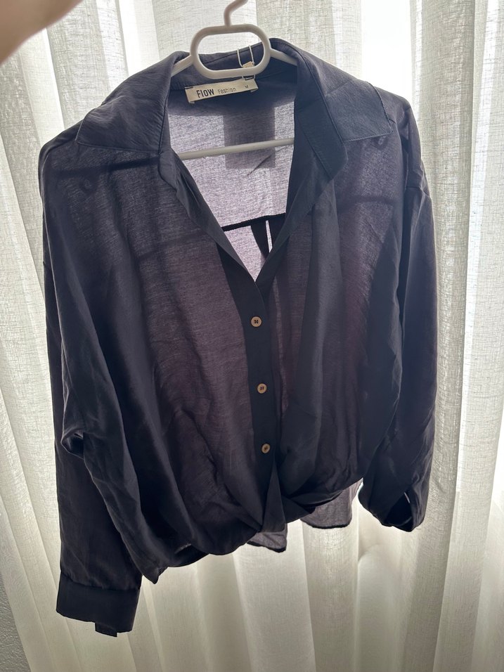 Düğmeli, uzun kollu siyah keten gömlek, bol kesim ve yakalı tasarıma sahiptir. Günlük kullanıma uygun, rahat ve şık bir parça.