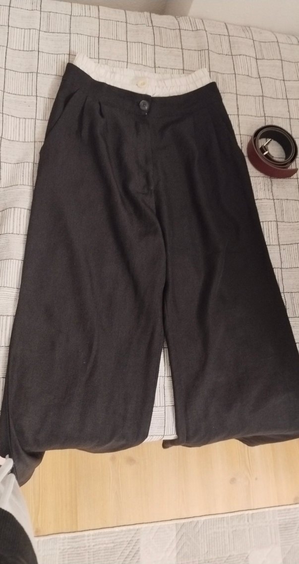 Düğmeli siyah keten kadın pantolon, midi boy ve normal kesim ile minimalist, günlük kullanıma uygun şık bir parça.