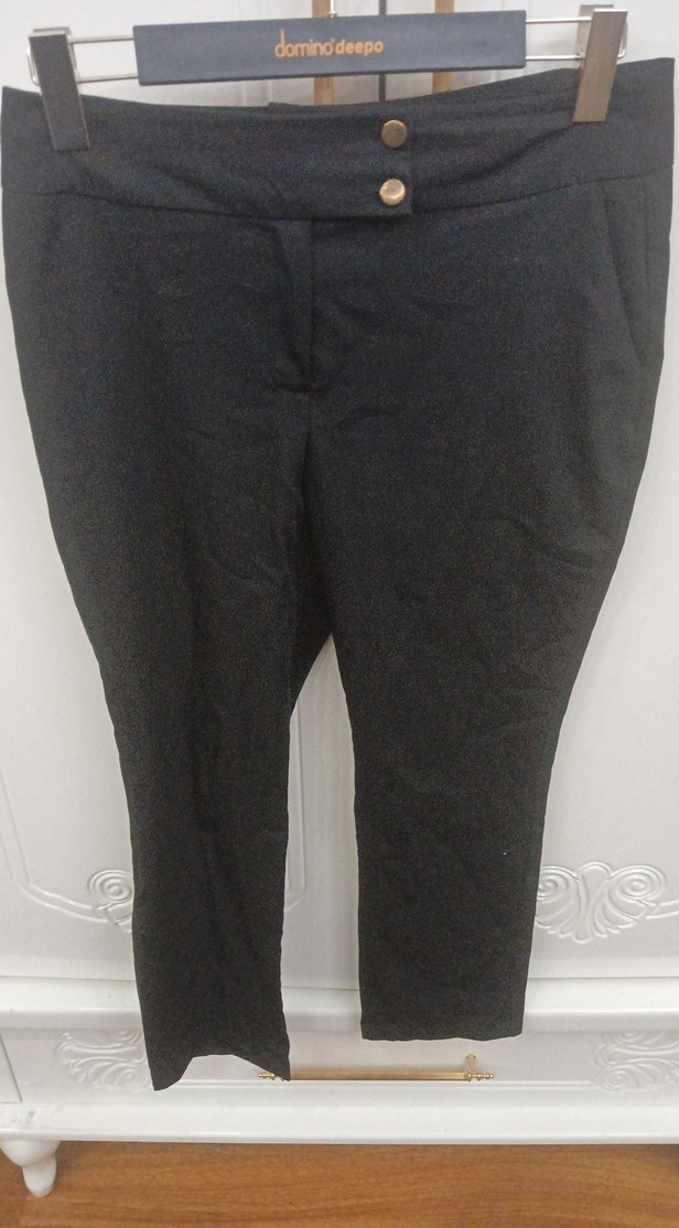 Düğmeli bel detaylı, normal boy midi kesim siyah keten kadın pantolon. Ofis ve günlük kullanıma uygun, rahat kesim.