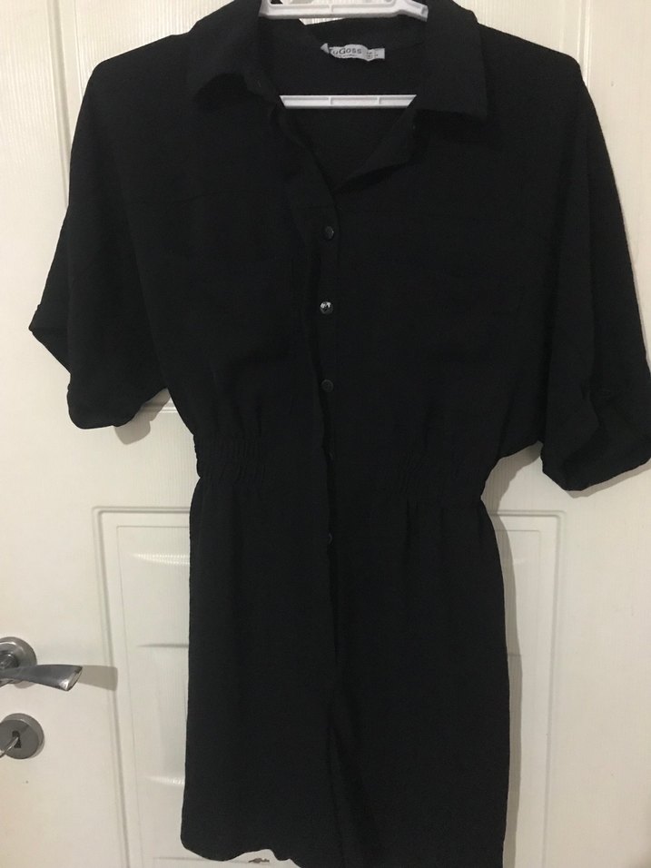 Düğmeli, siyah keten kadın tulum, yakalı, kısa kollu ve bol kesimlidir. Midi boyda olup minimalist goth tarzını yansıtır, ofis için uygundur.