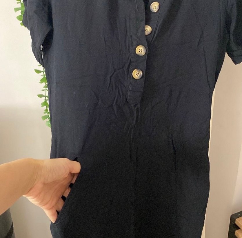 Siyah keten kumaştan üretilmiş, V yaka, kısa kollu, düğmeli ve midi boyda kadın tulumu. Rahat ve salaş kesimiyle günlük sokak stiline uygun.