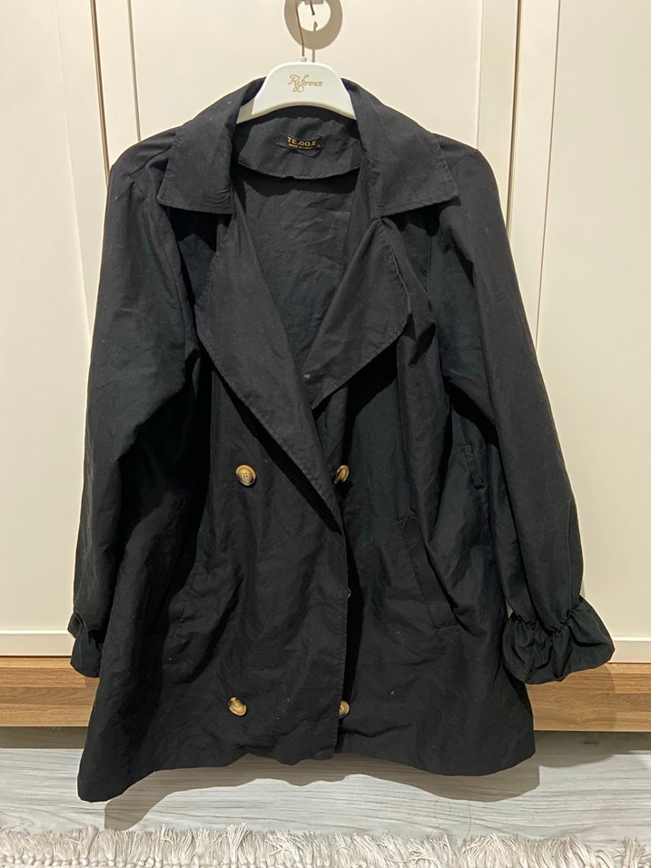 Düğmeli siyah keten trençkot, notalı yaka ve uzun kolludur. Salaş kesimi ve midi boyuyla günlük sokak stiline uygundur. Desensiz ve şık bir tasarıma sahiptir.