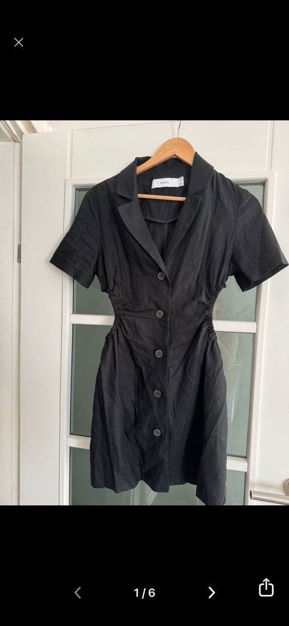 Düğmeli ön kısmı ve keten kumaşıyla siyah mini elbise, kısa kollu ve kesik yaka detaylıdır. Ofis için uygun, rahat bir kesime sahiptir.