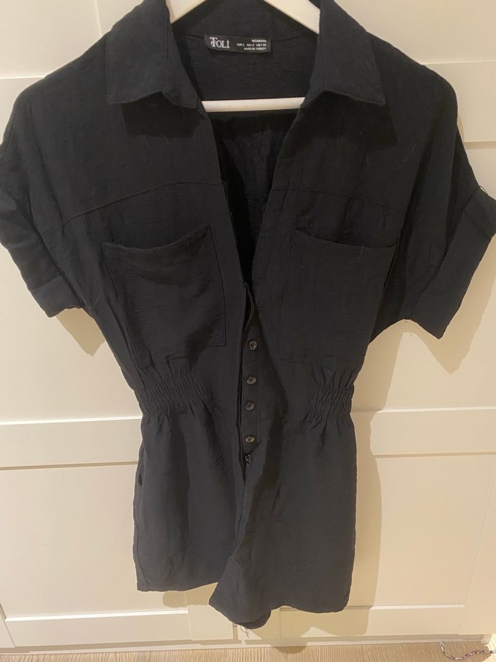 Siyah keten mini tulum, düğmeli ve yakalıdır. Kısa kollu, bol kesim ve iki ön ceplidir. Günlük sokak stiline uygun minimalist tasarımdadır.