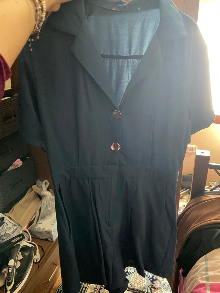 Düğmeli ön kısmı, kısa kollu ve keten kumaştan yapılmış siyah midi tulum. Notlu yaka ve bol kesimiyle ofis ve günlük kullanıma uygundur.