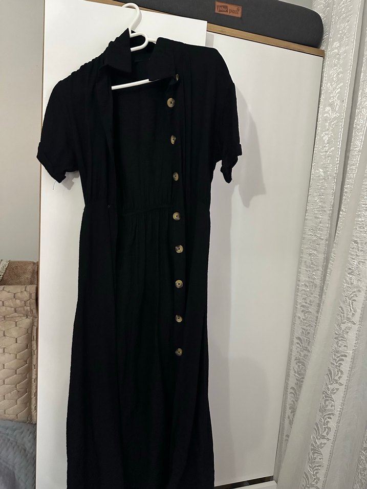 Düğmeli, kısa kollu siyah keten elbise, notched lapel yakaya sahip. Minimalist goth tarzıyla günlük kullanım için uygun.