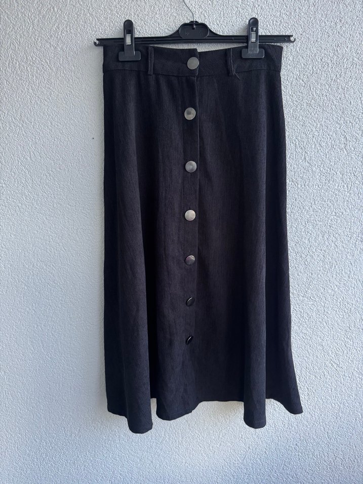 Siyah, keten kumaştan yapılmış, düğmeli ve bol kesim uzun etek. Minimalist goth tarzıyla günlük kullanıma uygundur.