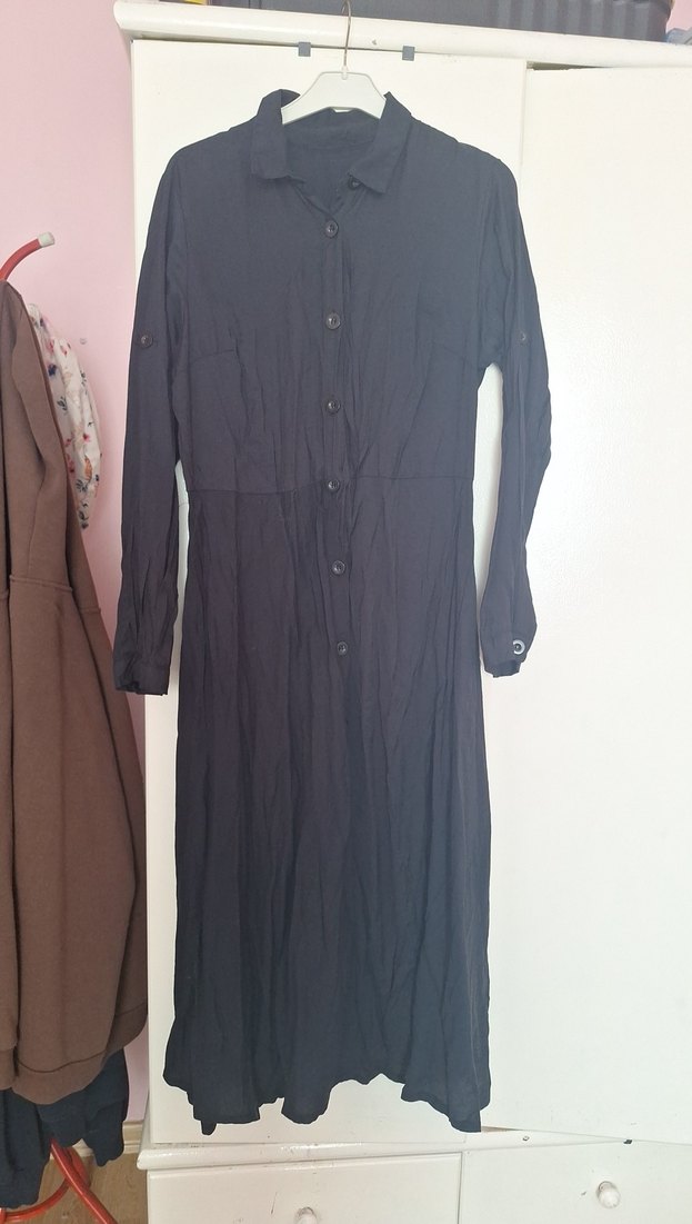Siyah keten uzun elbise, uzun kollu ve düğmeli ön detaylıdır. Minimalist goth tarzı ve bol kesimiyle günlük kullanıma uygundur. biraz kırışık resimde normalde üzüleyip gönderim sağlarım.
