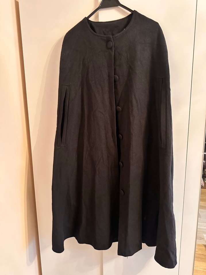 (Butik mağaza ürünü)Düğmeli, siyah keten uzun kadın pelerin, salaş kesimiyle ofis için gotik tarzda şık bir seçim.