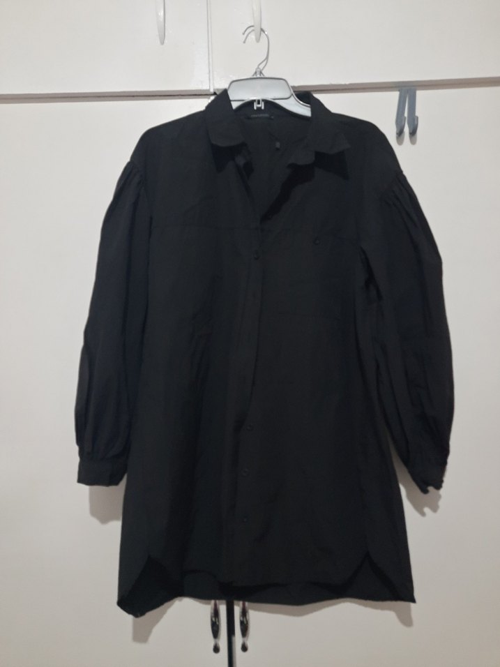 Siyah keten, yakalı ve düğmeli uzun kollu gömlek. Rahat kesimi ve midi boyu ile gündelik kullanıma uygun. boy84.k.kola54.kol52cm geniş omuzlu bol buzgulu kolları var hiç kullanılmamış