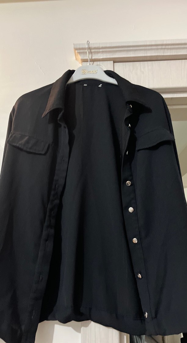 Siyah keten kumaştan, düğmeli, uzun kollu ve notched lapel yakalı bu gömlek, rahat kesimi ve uzun boyuyla trend sokak stiline uygundur.