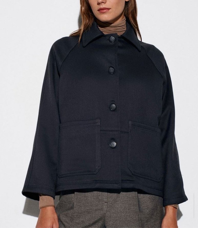 Düğmeli, siyah renkli ceketi, uzun kollu ve kesimli yaka detayına sahiptir. Kısa boyu ve yumuşak kumaşıyla ofis ortamına uygundur.
