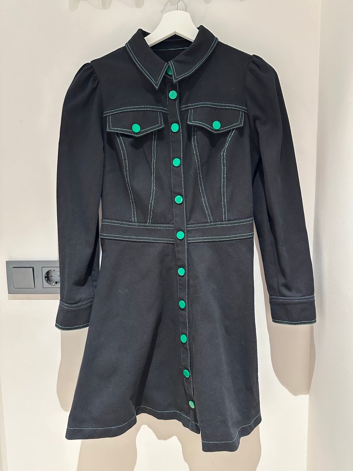 Düğmeli, siyah kısa denim elbise.Notlu yaka, uzun kollu ve baskılı detaylara sahip, günlük kullanıma uygun regular fit.