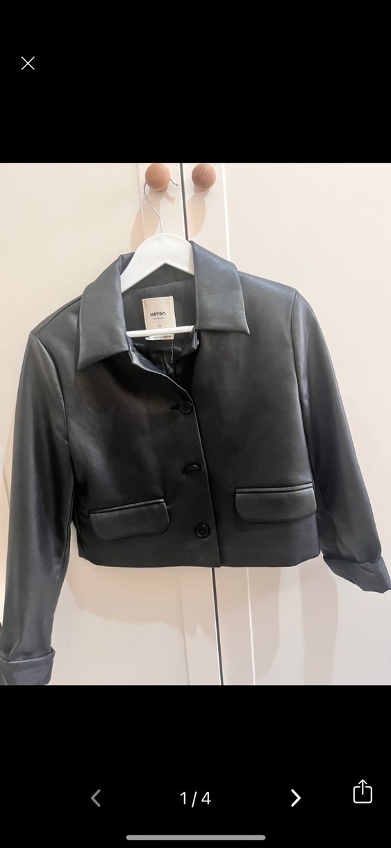 Bu siyah deri kadın ceket düğmeli ön ve kesik yaka detayı ile dikkat çekiyor. Uzun kollu, kısa boylu ve düzenli kesime sahip, ofis için uygun şık bir parça.
