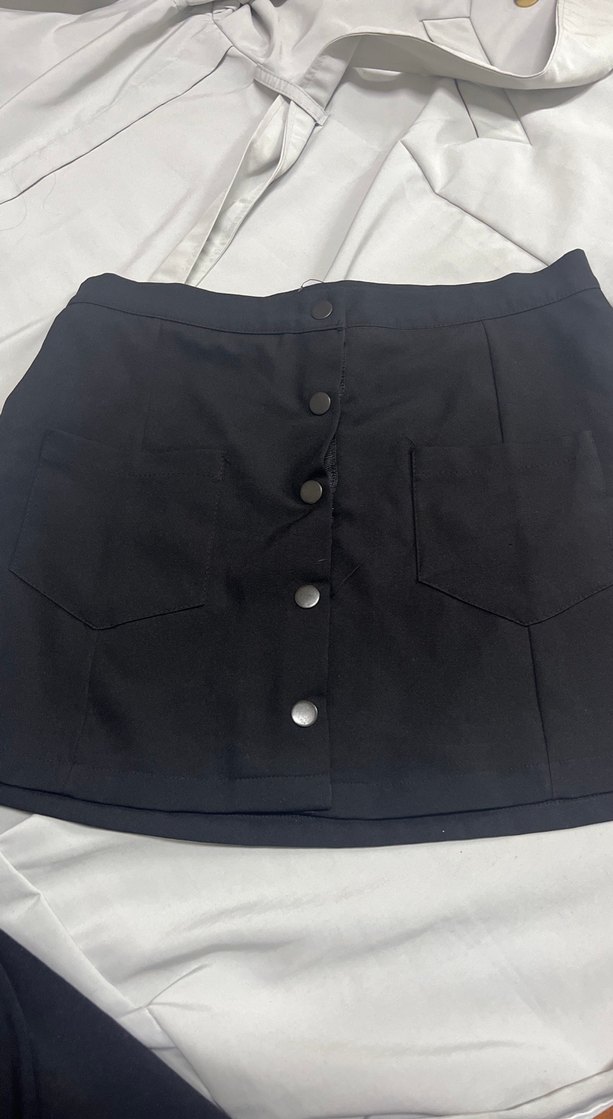 Önden düğmeli, cepli siyah mini etek. Sentetik kumaştan, minimal goth tarzında, günlük kullanıma uygun.
