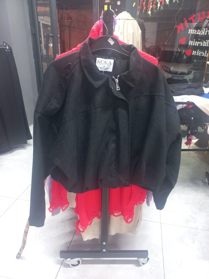 Düğmeli, uzun kollu, notched lapel yakalı siyah kısa ceket. Yumuşak fleece kumaştan, gevşek kesim ve hafif desenli, günlük kullanıma uygun.