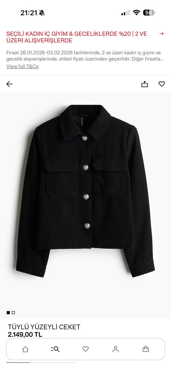 hm marka sıfır kaşe ceket Siyah renkli, kısa boy, düğmeli ve kesimli yakalı kadın ceketi. Uzun kollu, rahat kesim ve yumuşak, sıcak tutan kumaştan üretilmiştir.