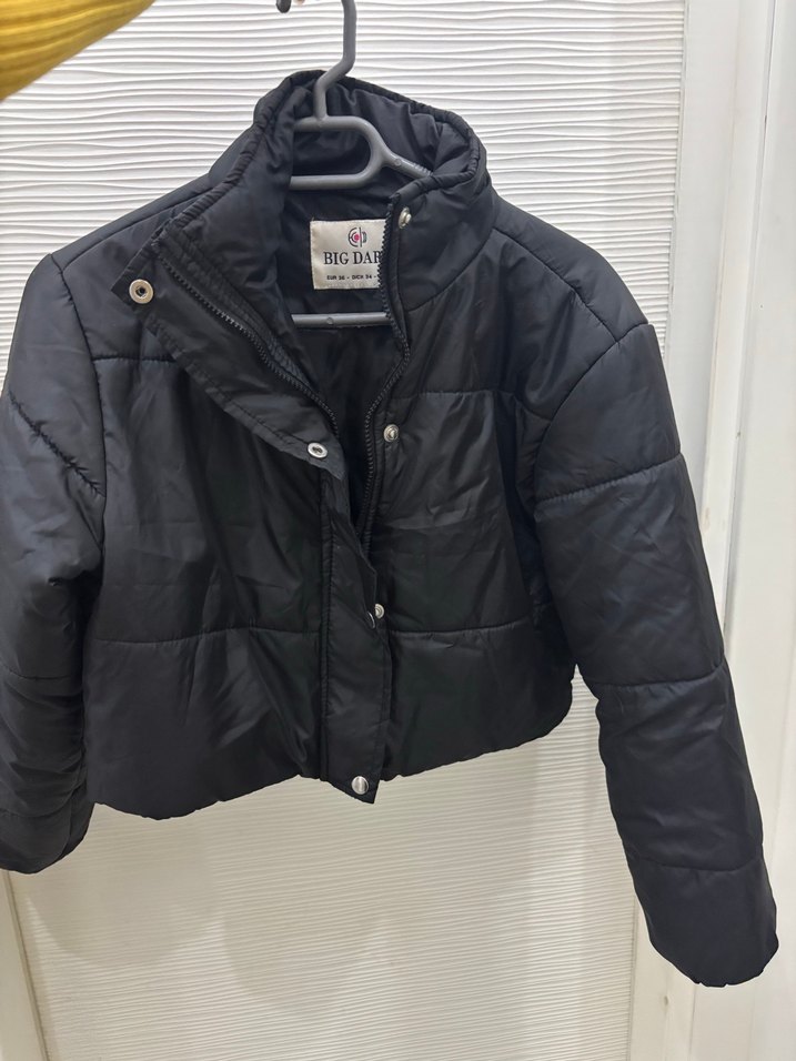 Düğmeli, uzun kollu, siyah kısa mont. Mini boy ve yakası kesik, yumuşak ve sıcak kumaştan üretilmiştir. Günlük kullanım için uygundur.