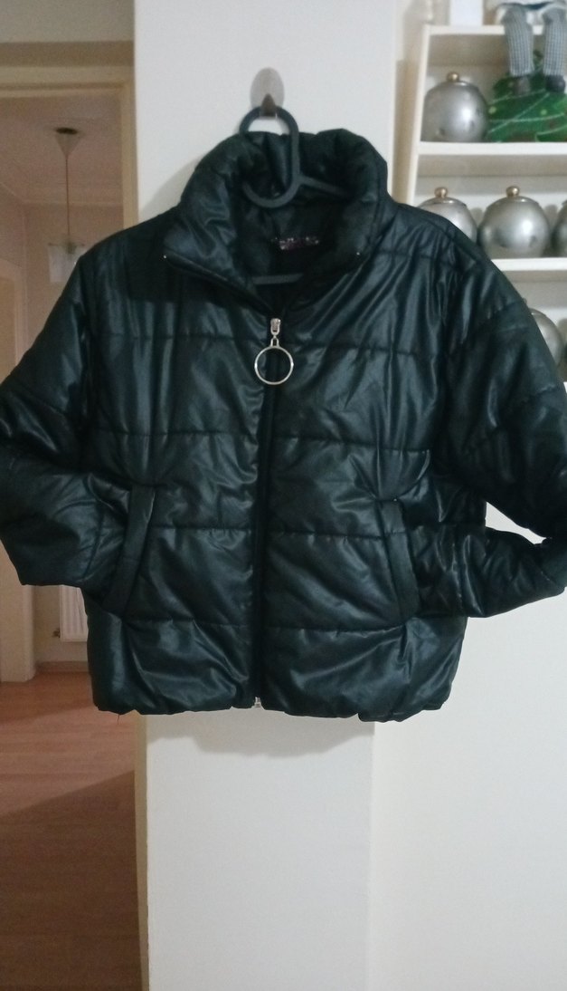 Düğmeli ön yüzü ve yüksek yakasıyla siyah, kısa kesim, dar kesim kadın mont. Rahat ve sokak tarzı, günlük kullanıma uygun.