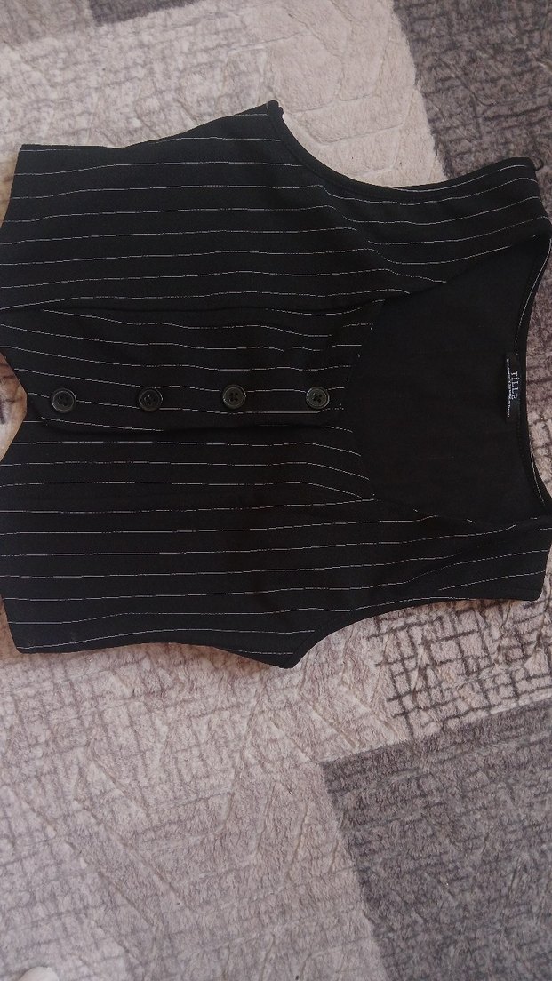 Düğmeli, siyah kısa kesim, yakalı ve kolsuz kadın yelek. Sentetik kumaştan, desen içermeyen şık tasarım, ofis kullanımı için uygun.