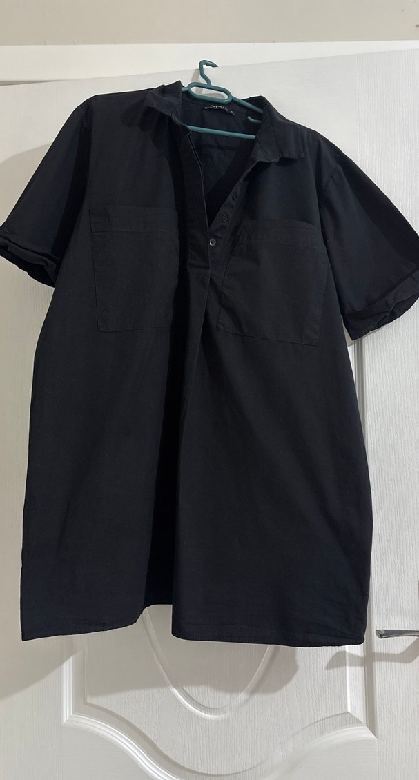 Siyah, kısa kollu, düğmeli ve yakalı elbise. Rahat kesimi ve yumuşak keten kumaşıyla günlük kullanım için uygundur.