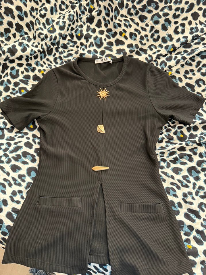 Düğmeli, kısa kollu, siyah hamile tunik. Yuvarlak yakalı, midi boyda, iki cep detaylı, sentetik kumaştan yapılmıştır.