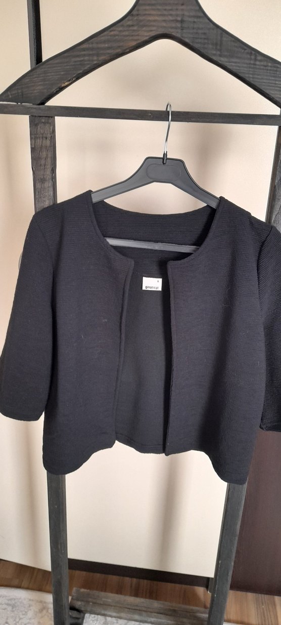 Siyah yün kumaştan, düğmeli, kısa kollu ve yuvarlak yaka kadın blazer. Kısa boyu ve regular kesimiyle ofis için minimalist normcore tarzda uygun.