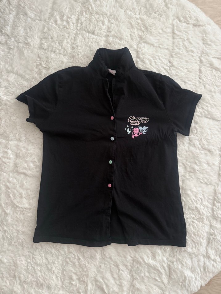 Düğmeli, kısa kollu, yakalı siyah pamuk gömlek, rahat kesim ve baskılı detaylı, günlük ev stili için uygun.