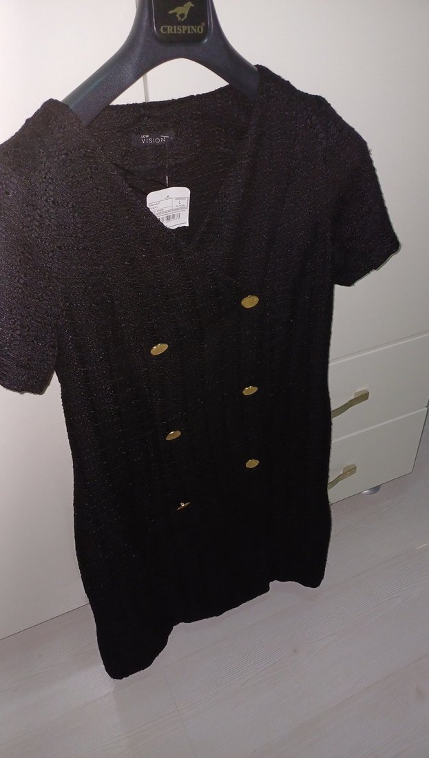 Düğmeli siyah triko elbise, kısa kollu ve yakasında çentikli yaka bulunur. Günlük şık kombinler için uygundur.