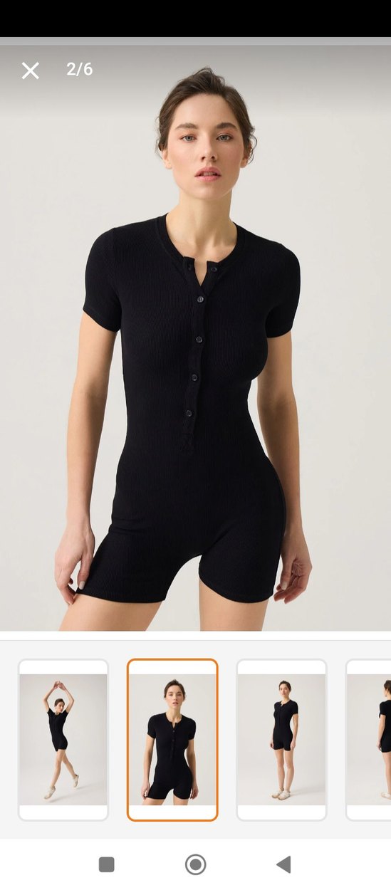 Düğmeli, kısa kollu, bisiklet yakalı siyah kısa tulum. Sentetik dokusu ve goth athleisure tarzıyla günlük kullanıma uygun.