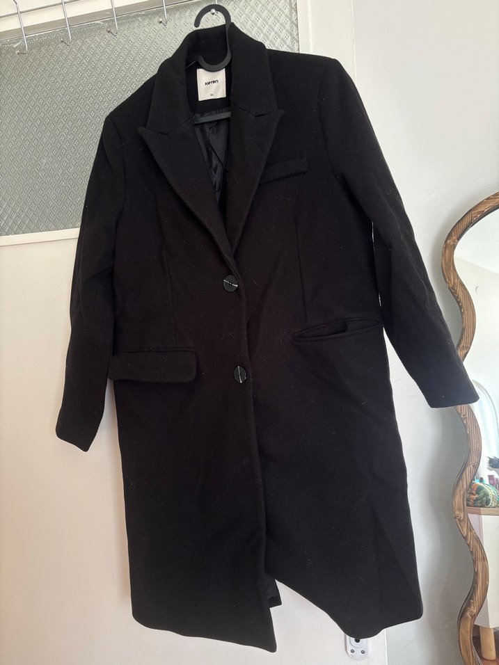 Düğmeli ve yakalı siyah uzun kaban, ön cepler ve astar ile sıcak tutar ve şık görünür.