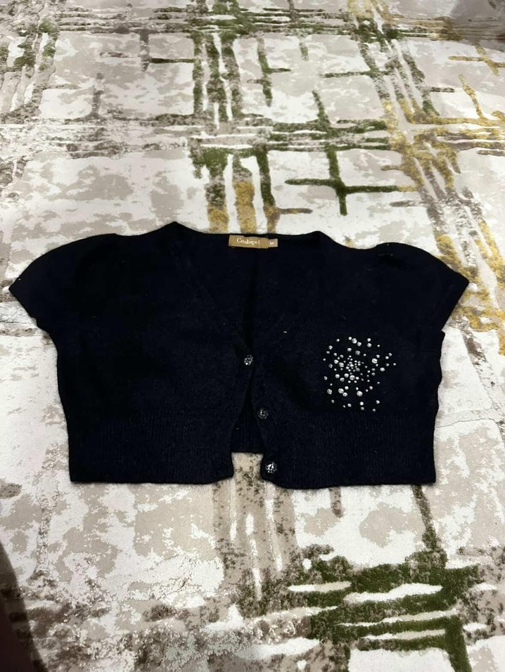 Düğmeli, kısa kollu, nakışlı siyah kız bolero. Triko kumaştan, straplez yaka ve oturmalı kesimle trendy casual goth tarzını yansıtır.