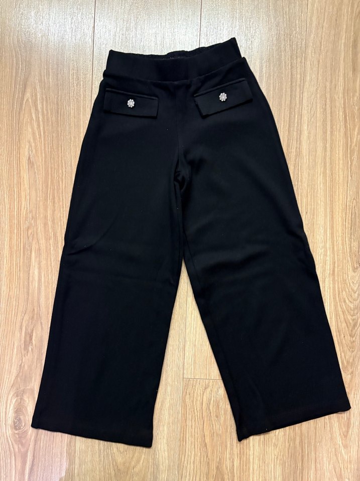 Siyah, düğmeli cepli, midi boy, regular fit kız Çocuk kumaş pantolon. Yumuşak ve sıcak kumaştan üretilmiş, rahat sokak stili için uygun.
