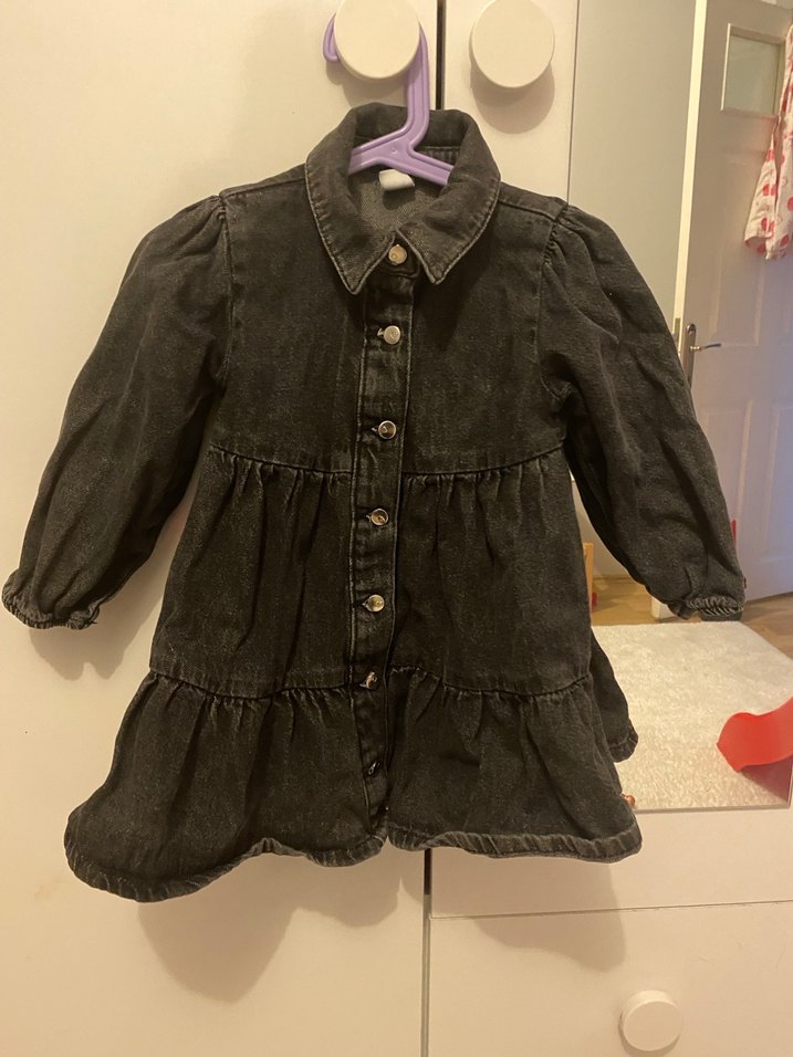 Düğmeli, uzun kollu siyah kot kız elbisesi. Notlu yaka ve bol kesimiyle sade ve trend bir görünüm sunar.