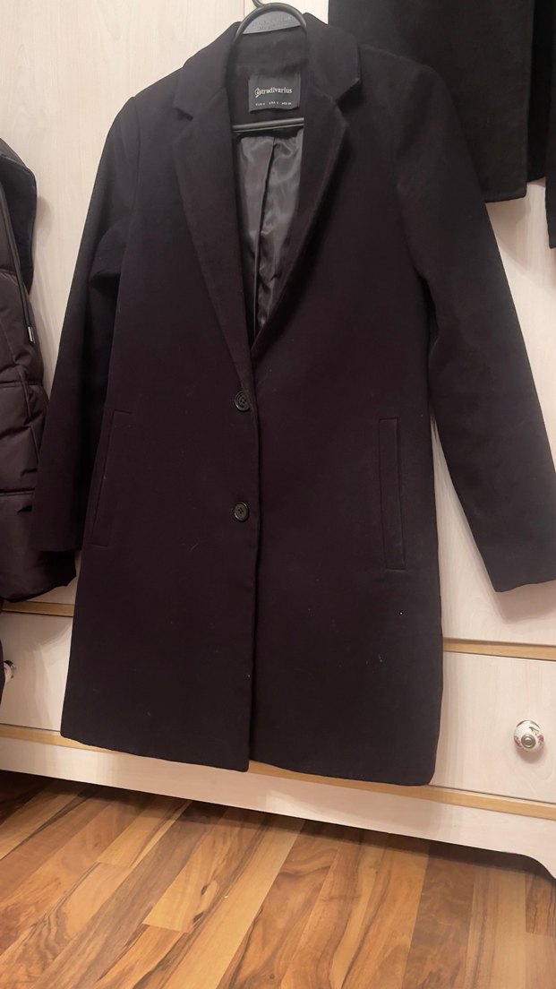 Düğmeli ve iki yan cepli siyah klasik kaban. İç kısmı düzgün astarlı, rahat kullanım sağlar. Kusuru yoktur orjinal stradivarius