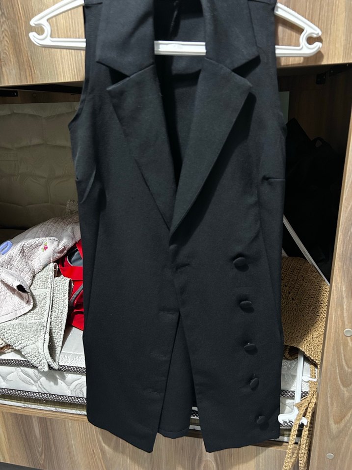 Kolsuz, düğmeli, siyah kadın takım ceketi. Notlu yakalı, sentetik kumaştan, midi boy ve regular fit. Ofis ve günlük sokak stiline uygundur.