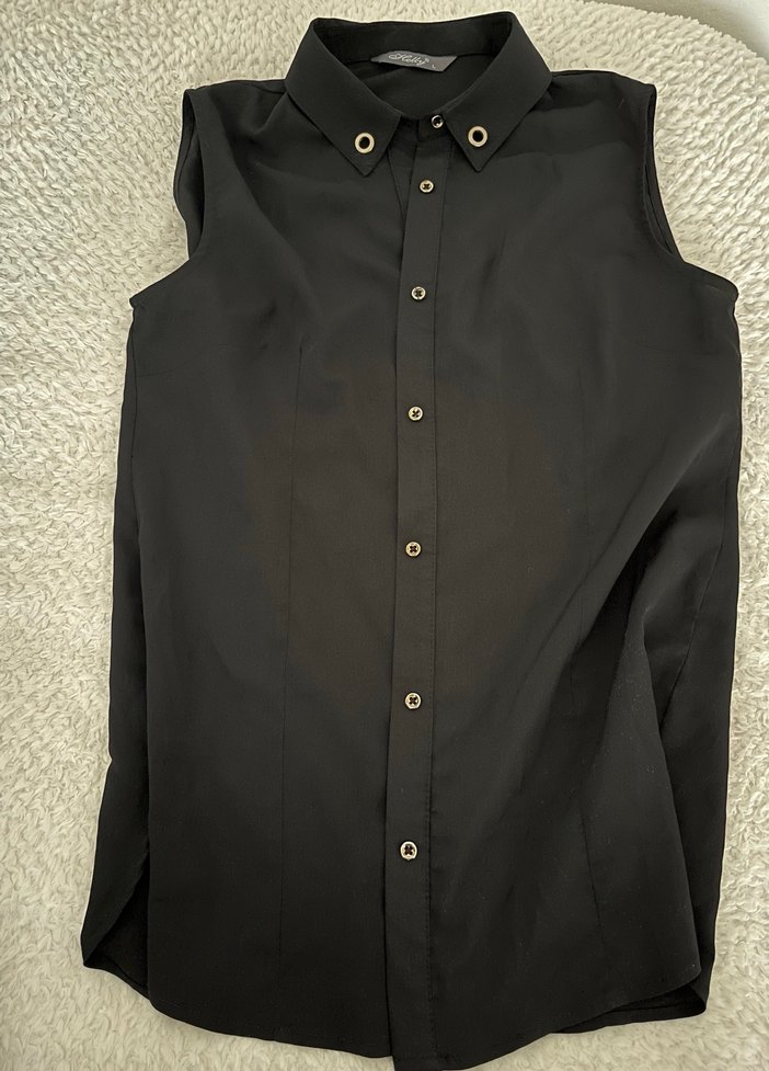 Düğmeli, kolsuz siyah gömlek, yakalı ve midi boyda. Düz, sentetik kumaştan, ofis için minimalist goth tarzda, rahat kesim.