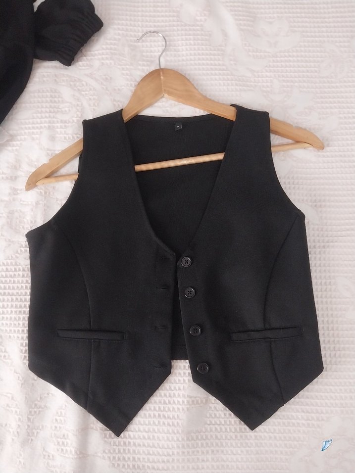 Düğmeli, siyah kolsuz yelek, kesikli yakaya sahiptir. Sentetik kumaştan üretilmiş, midi boy ve klasik kesimdir. 1 kere kullandım sadece temiz. milladan almıştım.